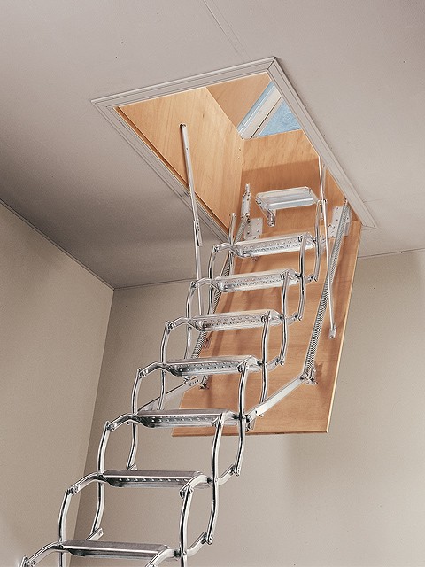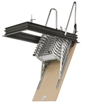 Escalera de tijera ZX DE TECHO provista de un exclusivo sistema de apertura tipo pantógrafo, muy cómodo de maniobrar